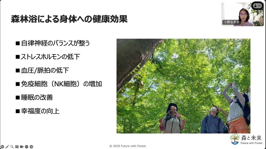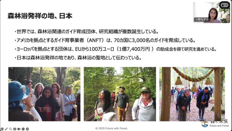 いま世界では、日本発祥の「森林浴」が高く評価され、その価値が広く認知されるようになっています。国際的な基準づくりの動きも検討されており、医療や介護などの分野でも、その効果への関心が高まっています。森と未来では2023年からインバウンドツアーを開催し、海外の方に日本の森林浴を体験する機会を提供しています。ツアーを通じて分かったことは、世界では森林浴のガイド育成団体や研究組織がものすごく増えていることです。また、どの方々も「日本は森林浴発祥の地」とおっしゃいます。