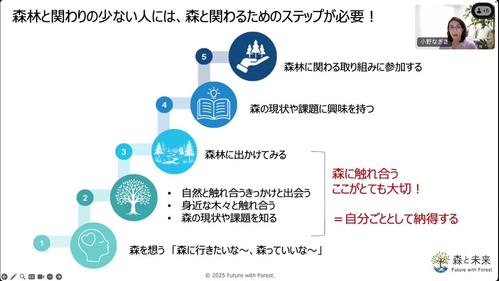 森林と親しむには、まず「森に行きたいな」など、森を想うことが必要です。そして身近な木々に触れてみたり、森の現状や課題について知る機会を得たりしながら、実際に森に出掛けてみて、“自ら森に触れ合う“ことがとても大切です。「自分には森が必要だな。この心地を大事にしたい」という自分の体感を持ってその感覚を得ることで、自然と森の現状や課題に興味を持ち、森林に関わる取り組みに参加してみようという行動に変わってきます。