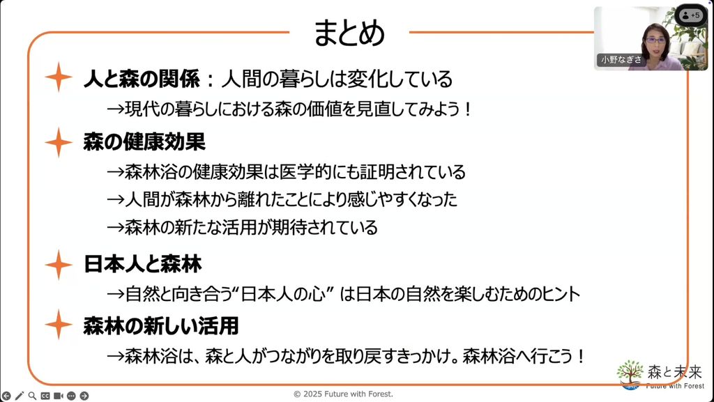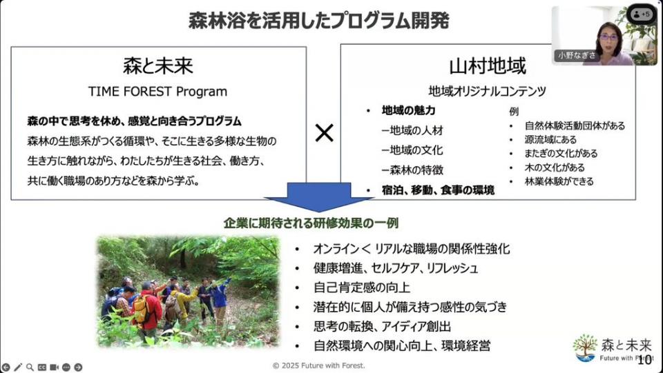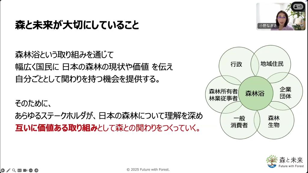 私たち「森と未来」が大事にしているのは、森林浴を通じて多くの人たちに日本の森林の現状や価値を伝え、自分ごととして関わりを持つ機会を提供することです。また、あらゆるステークホルダーが日本の森林について理解を深め、互いに価値のある取り組みとして森林との関わりをつくっていくことです。