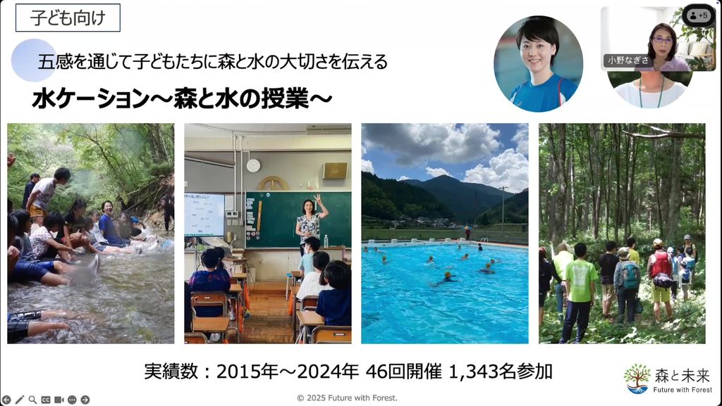 森林の価値を伝えるために、山村の方々と一緒に地域オリジナルの研修ブログラムを開発しています。また、山村地域で放置された森を森林浴に活用するための支援や、地域の方々が自分たちの地域の魅力を知り、住民が主役になれるコンテンツ作りをお手伝いしています。その他、ここ10年ほどは全国の小学生向けに、森と水のつながりや大切さを伝えるため、元競泳日本代表の萩原智子さんと「水ケーション~森と水の授業~」を行っています。