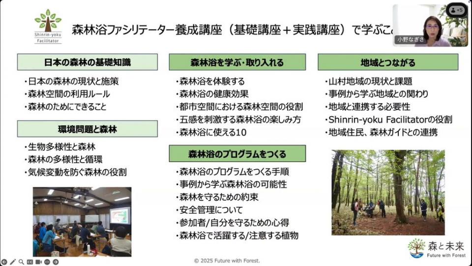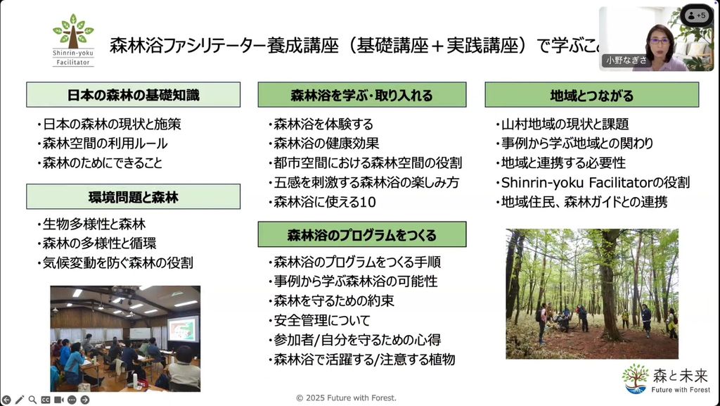 森林の現状を理解し、地域と共に森の新しい価値を生み出す「森林浴ファシリテーター」の育成も行っています。参加者だけのメリットだけでなく、地域や森林、主催者も価値を感じられる取り組みとなるよう「三方、四方、五方よし」の視点を大切に、森林浴を取り入れ、森と人が触れ合う機会を創出する役割を担っています。そのほかに講演活動、書籍執筆などの普及・啓発にも取り組んでいます。