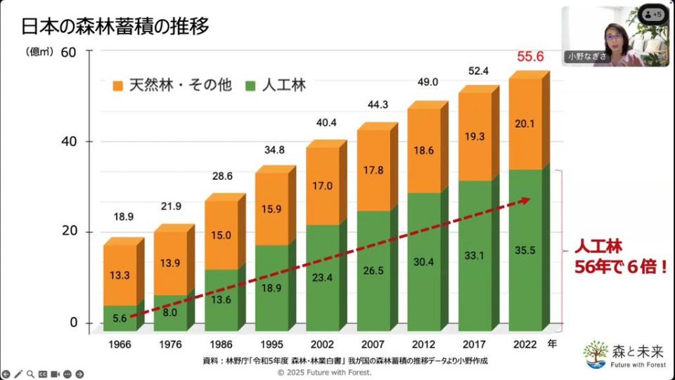 世界の森林面積は陸地の31%、約40億6000万haですが、ここ30年間で日本列島5個分ほどが減少しています。その一方で日本では森林蓄積量(森林を構成する樹木の幹の体積)が増加をしており、特に人工林は、56年間で6倍になっています。人工林がたくさんあるにもかかわらず、維持されているのは、世界的にもすごいことです。