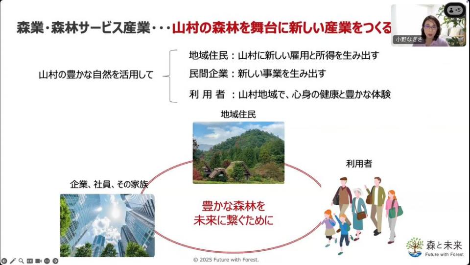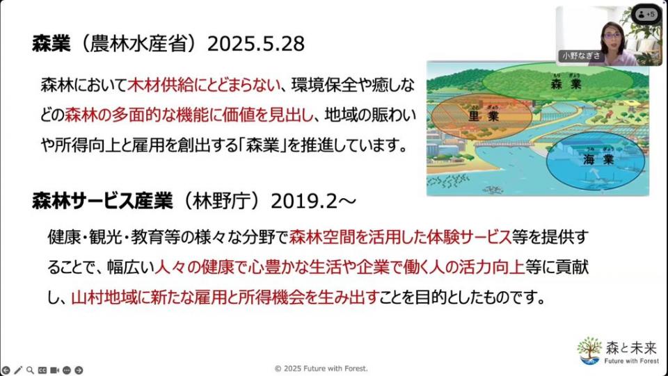 近年、農林水産省では、都市と地方の連携や、農林水産に関わりの少なかった企業との共創・新結合による新しいイノベーションが必要として、5月に「地方みらい共創戦略」で「森業(もりぎょう)」の推進を位置づけました (2025.10.15現在) 。また、林野庁は森林空間を活用し、健康・観光・教育などの体験サービスを提供する「森林サービス産業」をつくる挑戦を始めています。
