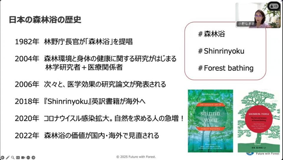 森林浴は1982年に当時の林野庁長官が提唱したのが始まりです。その後「森林療法」という言葉が出てきて、2000年代に入ると医療関係者も加わり、森林環境による人体への影響を研究するようになり、森林が身体に良いというエビデンスが発表されました。2020年には、コロナウイルスの感染が拡大し、世界的に自然を求める人が急増したように、現在は森林浴の価値が見直されています。