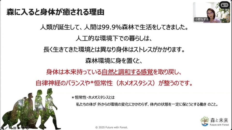 人類は誕生してから、99.9%を森林で生活してきました。森へ行くと何かが治ると言うより、人間は森林環境に身を置くことで、身体は本来持っている自然と調和する感覚を取り戻し、自律神経のバランスや恒常性が整うとわたしは考えています。