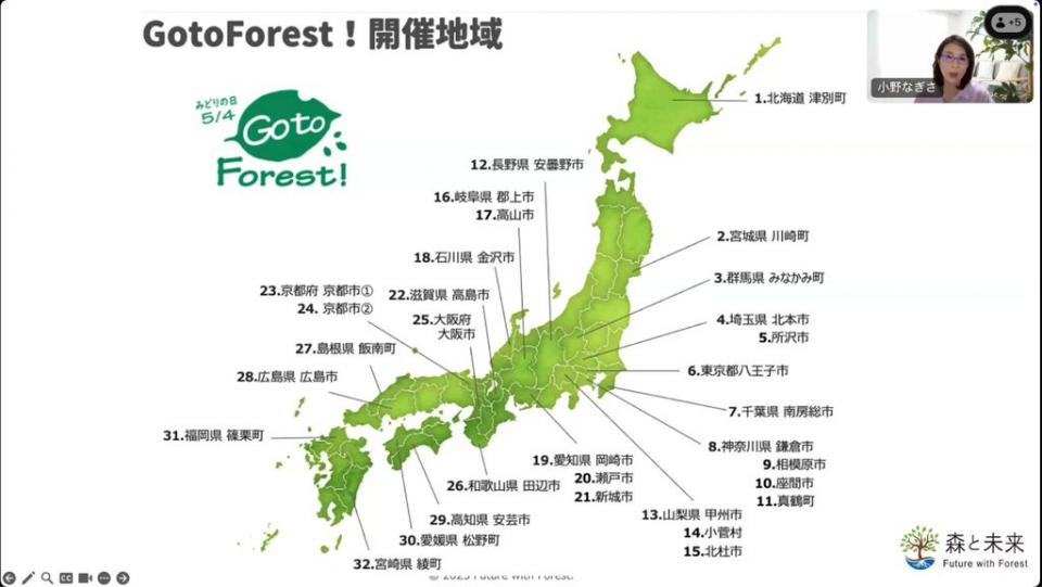 新型コロナウイルス禍の時期には県外移動禁止が出され、森林環境教育や体験サービスに関わる人は仕事がなくなりました。国からも特段支援がなかったため、全国の森で活動する方々に呼びかけをし、毎年5月4日の「みどりの日」に、森に触れ合う機会を提供する「Go to Forest !」を開催しています。各地で同じ日に森に入るので、一つの地域で少人数の開催でも、全国単位で見れば大きなイベントとなり数百人の方を森にお連れすることができるからです。