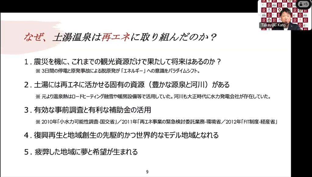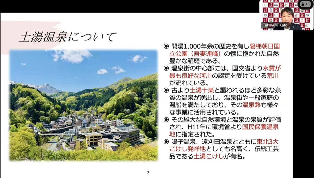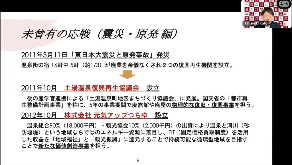 福島県の山あいにある土湯温泉が、震災と原発事故を乗り越えながら取り組んできた、持続可能な温泉観光地づくりの実践をご紹介。再エネ事業や地域循環モデル、発酵文化を活かした食のブランディングなどを通じたGX・DX・HXによる「まちのこし」戦略の挑戦と展望をお伝えします。
