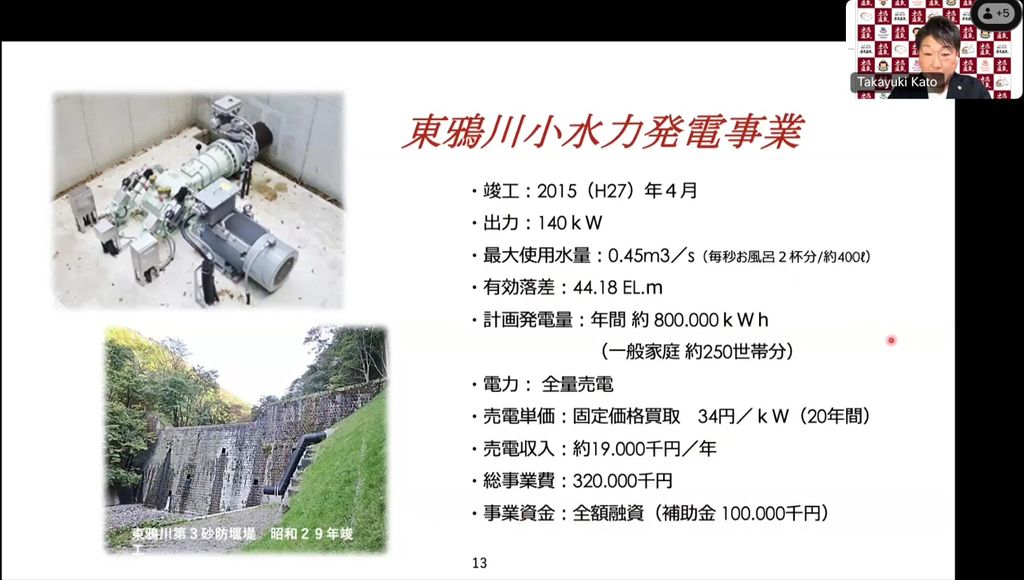 小水力発電を行うため、国土交通省の許可を得て砂防堰堤に穴を開けて、44mの落差を作りました。発電量は140kWで、一般家庭の約200~250世帯分に相当します。総事業費は3億円、FIT制度により34円/kW(20年間)で売電し、売電収入は年間約2,000万円です。