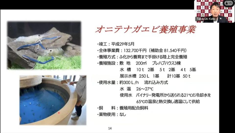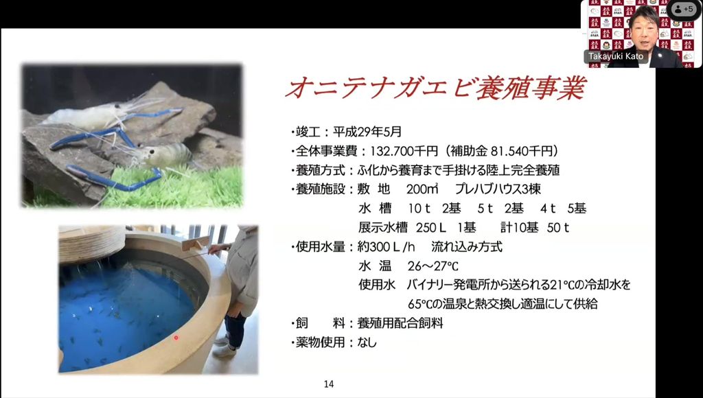 水源地からバイナリー発電所に引いた冷却水は、発電所内をめぐる中で21℃前後に暖められます。当初は川に戻していましたが、もったいないと考えていろいろと検討しました。最後にたどり着いたのが、東南アジア原産の温暖な海流で育つオニテナガエビです。養殖が簡単、山の中でエビは面白いなど、さまざまな理由で着地しました。地熱発電への理解促進に活用できる補助金を活用してスタートし、現在はふ化~養殖までの陸上完全養殖で、約2万匹を出荷しています。また、エビを釣り、その場で焼いて食べる観光アクティビティーを生み出しました。