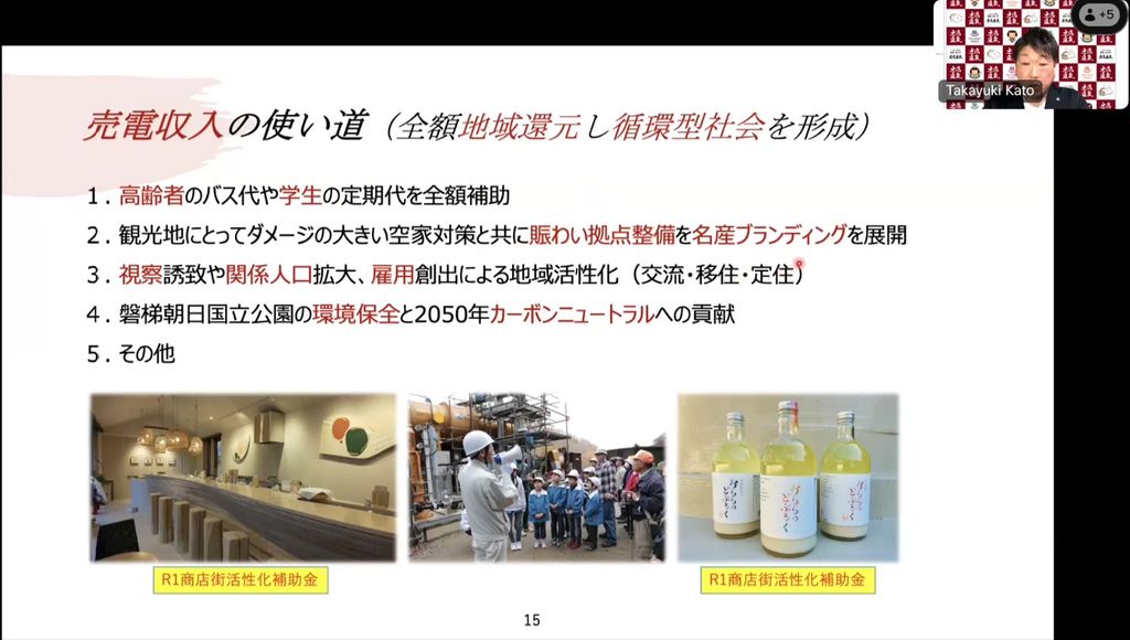 売電収入の一部は、町が全高齢者に配布するバスの定期券購入や、土湯温泉から市内に通学する学生の定期代の全額補助、にぎわい拠点の整備、名産品のブランディングなどに活用しています。こうした土湯温泉の取り組み内容が評価され、非常に多くの視察客が訪れるので、観光振興にもつながっています。
