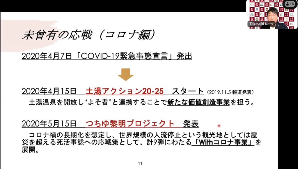 さまざまな事業の芽が出てきた2020年に新型コロナウイルス感染症が流行し、ある程度整っていた観光基盤を、いかに活用していくかが命題になりました。震災時以上に人流が減る中で「ローカルな温泉地は、人がどんどん減るのは避けられない。持続可能にしていくには人が大事」と考えました。