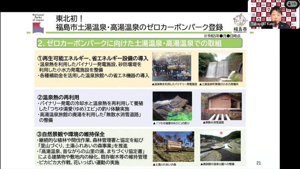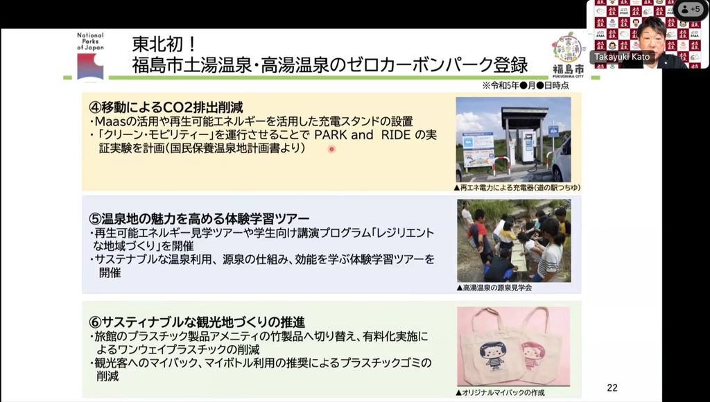 これまでに再エネ、温泉熱の再利用に加えて、自然景観の環境維持・保全も行ってきました。また、EVの充電器設置、子ども中心の学習ツアーも行っています。さらに、アメニティーの脱プラ化、マイバッグやマイボトルの利用、ICTの活用によるテレワーク環境の充実なども進めています。