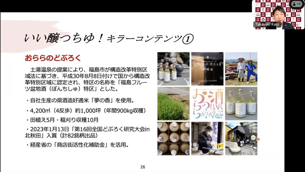 その一つのどぶろくは、通称「どぶろく特区」を福島市に取得していただき、土湯温泉で作り始めました。酒米から全部、自分たちで生産する決まりがあり、福島県産の酒造好適米「夢の香」を自主生産しています。