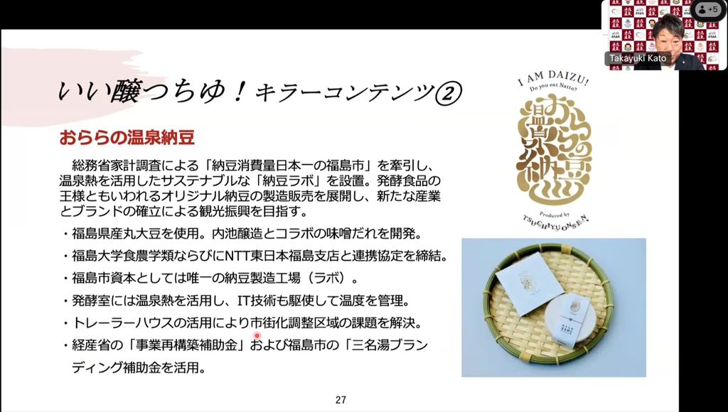 もう一つは納豆です。福島市は総務省の家計調査で、納豆の消費量が日本一である一方で、工場が1軒もなかったため、土湯温泉に「納豆ラボ」を作りました。発酵は温泉熱、水は荒川の水、大豆は県産大豆と、地域の資源を最大限に活用しています。