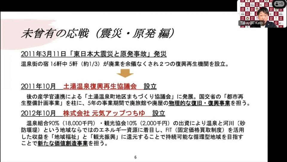 2011年3月に東日本大震災と福島原子力発電所の事故が発生し、旅館16軒のうち5軒が廃業しました。しかし、これまで、洪水や火事などを乗り越え千年の歴史を歩んできたため、「このまま負けてたまるか」との思いで復興再生機関を独自に設立して復興に取り組みました。まず国土交通省の補助金により、事業期間の5年間で廃旅館や廃屋の復旧・復興事業を行いました。また、2012年10月には、新たな価値創造事業を行うため、まちづくり会社の「元気アップつちゆ」を設立しました。