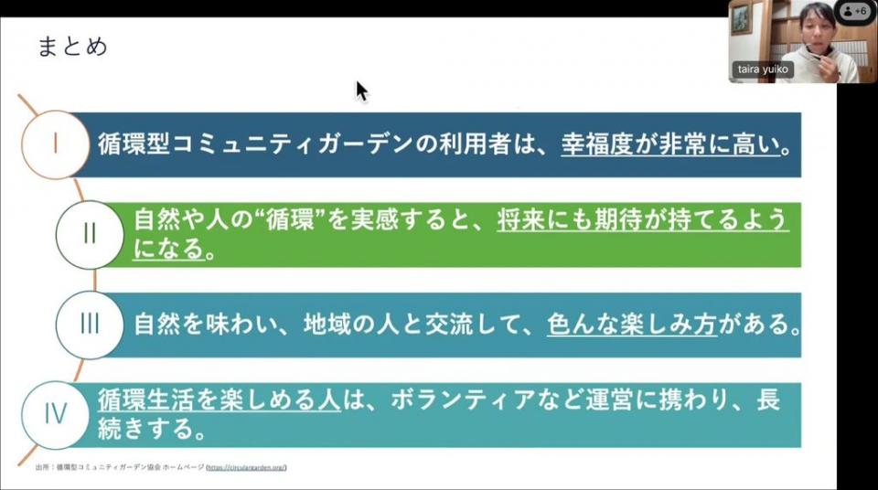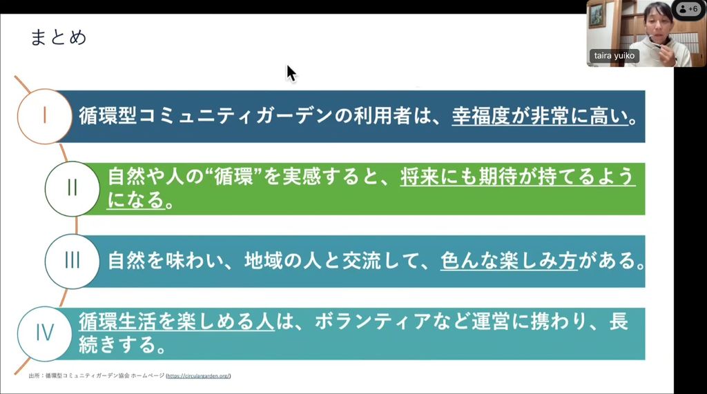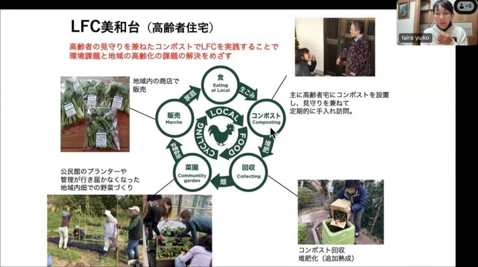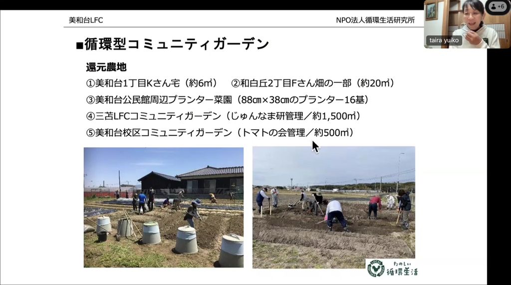 気候変動という大きな課題に対して、私たち一人ひとりができる身近な行動として、家庭の生ごみを減らしながら、土を育て、地域で食と命の循環を実現すること。誰もが参加できる「たのしい循環生活」を手段として、地域の資源や人をどうつなげていくのかを紹介し、循環型コミュニティガーデンとコンポストを中心に、都市部から拡がる持続可能な食の循環への挑戦についてお話をします。
