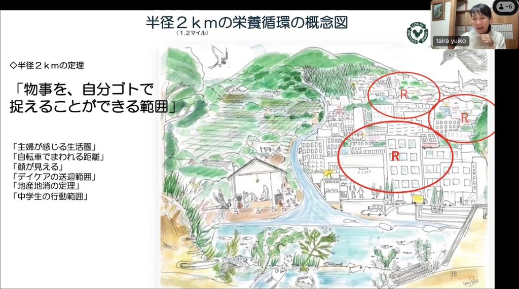 堆肥は自分自身や地域でつかうことが大切なので、私たちは半径2kmの栄養循環をうたっています。2㎞は「物事を、自分ゴトで捉えることができる範囲」で、地産地消の定理や、顔が見えたりする距離でもあります。