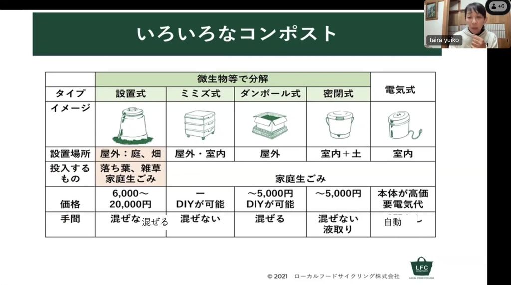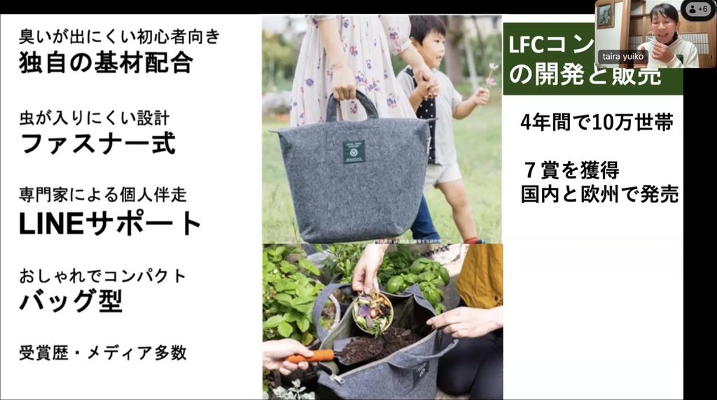 私たちは半径2km単位で、いろいろなコンポストを使っています。その一つがファスナーで管理できるバッグ型のLFC(ローカルフードサイクリング)コンポストです。実は生ごみとして捨てる部分は成長する部分でもあり、栄養も抗酸化作用もあります。そのため微生物の活動が活発化して、どんどん小さく分解され、生ごみを入れてもいっぱいにならないということが起こります。それをバッグの中で行えば、栄養を移動しやすいと考えたのです。また、できた堆肥をマルシェに持っていくと、野菜と交換できる仕組みを地域でたくさん作りたいと思いました。