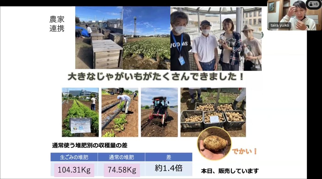 堆肥を地域で活用するため、みんなでつくった堆肥を持ち寄り、花壇などで使うコミュニティガーデンを増やすことにも取り組んでいます。例えば神奈川県座間市で行った「フードサイクルプロジェクト」では、参加した住民が「生ごみをコンポストに入れたことで、どれぐらいCO2を減らせたか」を計算。堆肥を農家さんに使ってもらったところ、通常の堆肥と比べて生ごみの堆肥は収穫量が1.4倍になりました。