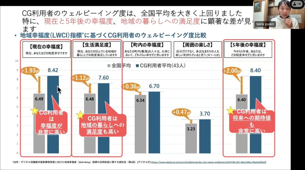 循環型コミュニティガーデンの恩恵は想像以上に大きく、ウェルビーイングを高める効果もあります。国が行った「満足度・生活の質に関する調査」の質問を、コミュニティガーデンの高齢者や若者にしてみたところ、すべてにおいて幸福度が高く、特に現在の幸福度が高い結果でした。また、5年後の幸福度への期待度も同様にとても高い結果でした。
