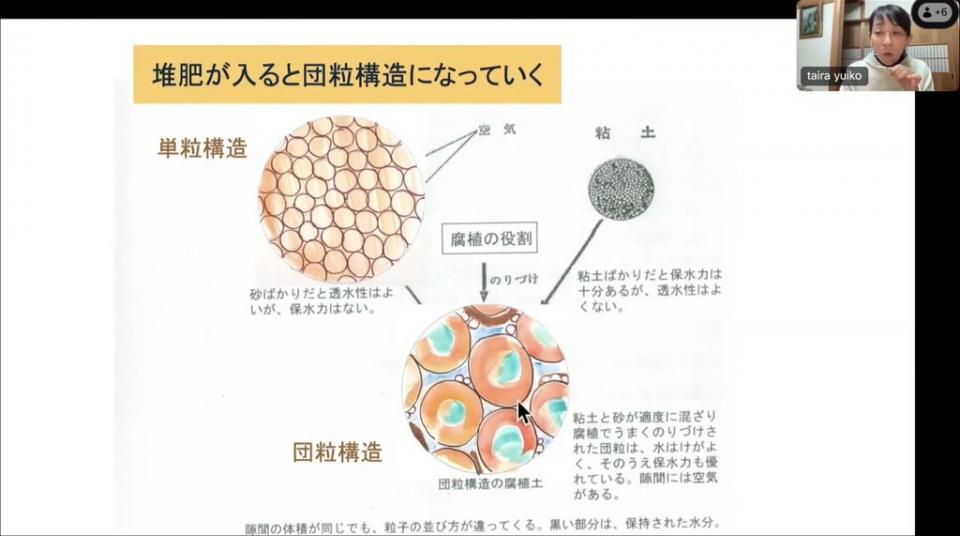 堆肥は砂や粘土の接着材のようになって団粒構造を作り、水、栄養、炭素などを貯留します。団粒構造だと隙間ができて酸素が行き渡り、森の中のような土に変わっていきます。そして水分、酸素、栄養すべてがそろうと、土中の微生物がどんどん増え、植物の根っこへの栄養の橋渡しをしてくれるので、生物多様性も豊かになります。