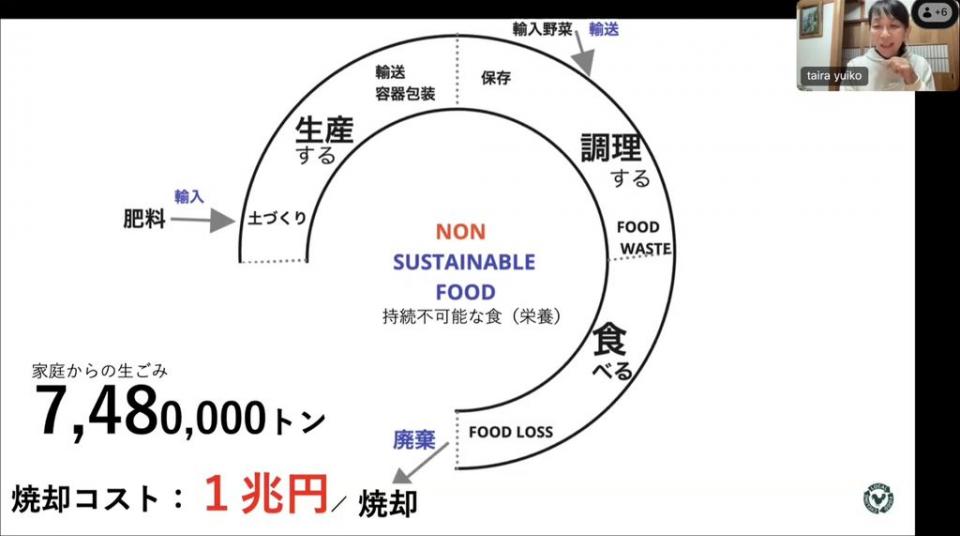 現在の食べ物は循環の最後で生ごみとして焼却しますが、家庭ごみは約1兆円をかけて、748万トンも焼却しています。また、世界の土壌では、ミネラルと栄養が喪失しており、今後世界中で都会への居住が進み、食べ物の廃棄物を活用せずに、エネルギーを使って焼却が進むと持続可能ではありません。