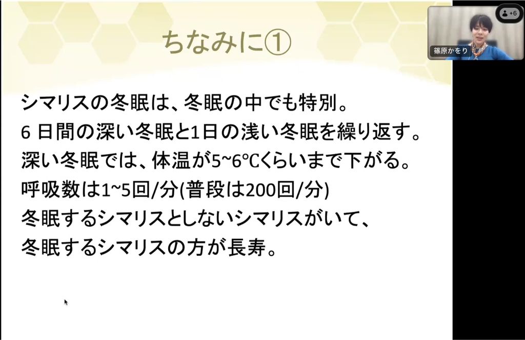 動物作家・篠原かをりが遭遇した生き物を軸に、生き物と自然環境についてお話します。クイズ形式で楽しみながら、身近な自然の魅力や生物多様性の重要性を改めて学べるます。一見、ヒト以外の生き物が存在しないように思える都会の喧騒の中にも、家の安らぎの中にも、小さな生態系が息づいています。日々の暮らしの中で見過ごしがちな自然とのつながりに目を向け、未来の私たちと生き物の関係について、共に考えていきましょう。