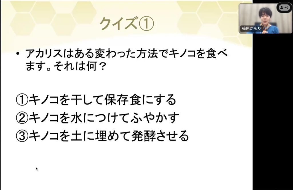 答えは「キノコを干して保存食にする」です。リスがよく食べるキノコは、人間にとっては毒キノコです。このように人間と体質が違う動物はたくさんいて、例えばハネオツパイという小動物は、アルコール代謝が得意でとてもお酒に強いのが特徴です。また、人間がよく食べるアボカドは、ほとんどの動物にとって毒ということが知られています。