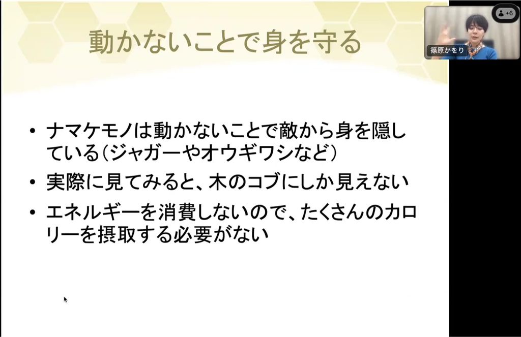 ナマケモノは動かないことで身を守ります。ある地域のオオギワシという大きな鳥のふんを解析したところ、食べた物のほとんどナマケモノだったそうです。ナマケモノは見つけられた時に逃げるのが難しいので、動かないことで身を守ります。動かなければエネルギーを消費しないので、多くのカロリーを摂取する必要がないというメリットがあります。ほとんどの生き物が飢えていることを考えると、飢えずに済むのは生きていく上で十分な強みだと思います。