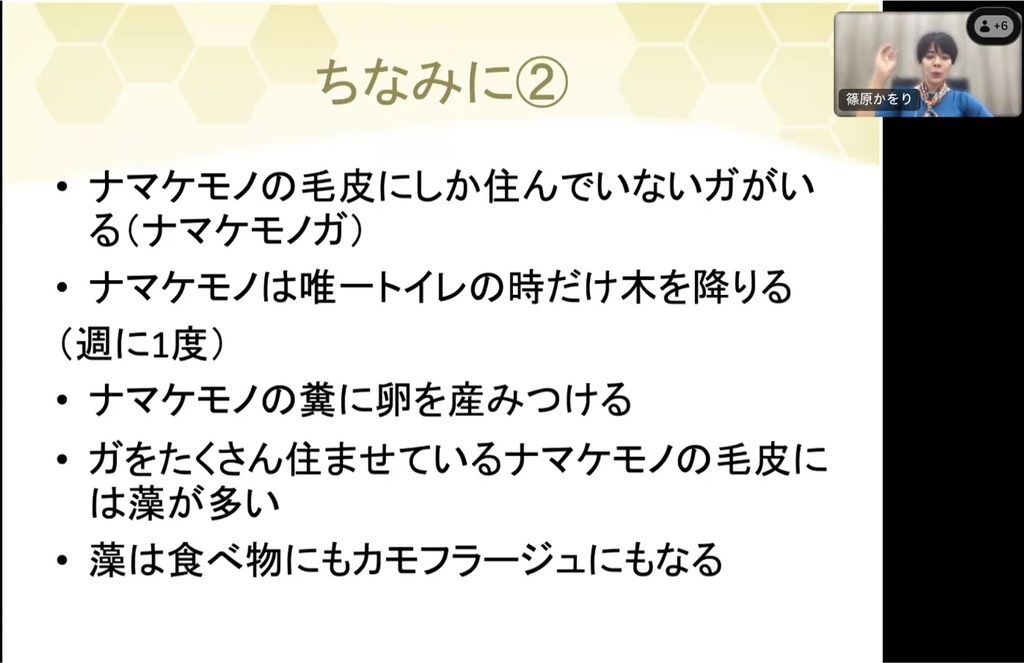 ただナマケモノも、週に1回程度、トイレをする時だけは木から下りて、木の根元にふんをします。木を降りることで、ナマケモノガというナマケモノの毛皮にしか住んでいない蛾の命がつながっていることが知られています。これは蛾のためだけにやっているわけではありません。蛾をたくさん毛皮に住まわせると、たくさんの窒素が供給されて体に藻が生えやすくなり、ナマケモノはその藻を食べているのです。また、毛皮に住まわせた藻はジャングルでカムフラージュにもなっています。