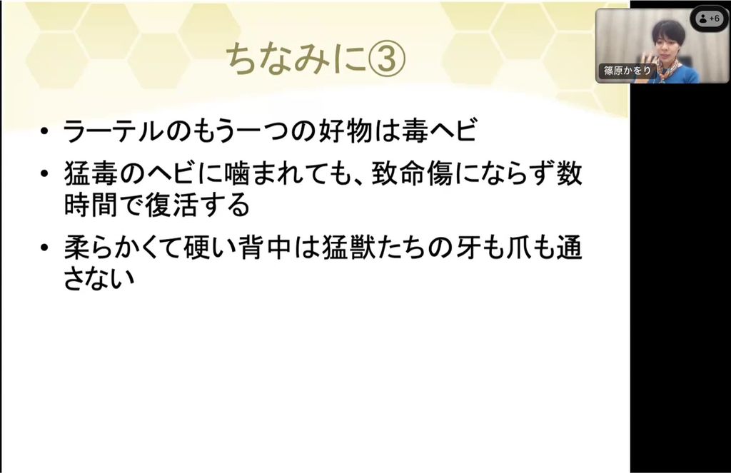 ラーテルは大きなイタチ科の動物です。ライオンにも立ち向かって食べ物を奪うので、よく「世界一恐れ知らずの動物」といわれます。私がラーテルの強みだと思ったのが、ミツオシエという鳥との共生関係です。ラーテルとミツオシエの好物はハチミツですが、ミツオシエはハチミツを探すことはできても、蜂の巣を壊す力はありません。ラーテルは低いところを歩くので、蜂の巣を見つけるのは難しいけれど、丈夫な前足で蜂の巣を壊すのは簡単です。そこでミツオシエは蜂の巣を見つけると、鳴いてラーテルに知らせるようになったのです。いつの間にかミツオシエはラーテルを頼るようになり、ラーテルもまたミツオシエが蜂の巣を見つけて鳴いていることを知るようになったそうです。誰かを頼ることで、できなかったことができるというのは、私も参考にしたい生き方です。