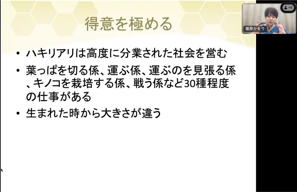 次はハキリアリの話です。高度に分業化された社会を営むと言われるアリやハチの中で、特に細かく分業しているのがハキリアリです。「農業をするアリ」として知られ、葉っぱを切る係、運ぶ係、運ぶのを見張る係、キノコを栽培する係、戦う係など30種程度の職業を持って生活していると考えられています。同じハキリアリでも、戦えるような大きい体の者、葉っぱの上で見張りができる小さな体の者など、生まれた時から形が違っています。