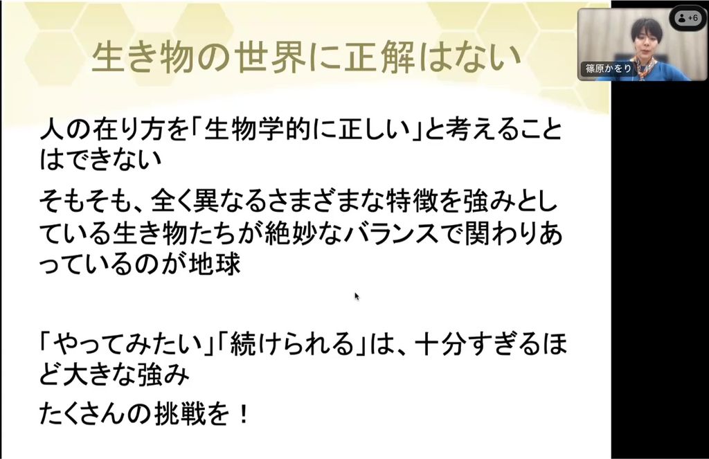 たくさんの個体が集まって暮らすということは、それぞれの違いがうまく生み出せる絶妙なバランスを保ちながら、いろんな社会や地球を回していくことです。その中では自分の視点だけにとらわれることなく、いろいろな生き物が違いを持っていることで、地球が成り立っていると考えることが大切です。例えばゴキブリは人間にとっては害虫と言われますが、別の視点から見ると花粉を運んだり、土壌を豊かにするという側面もあります。